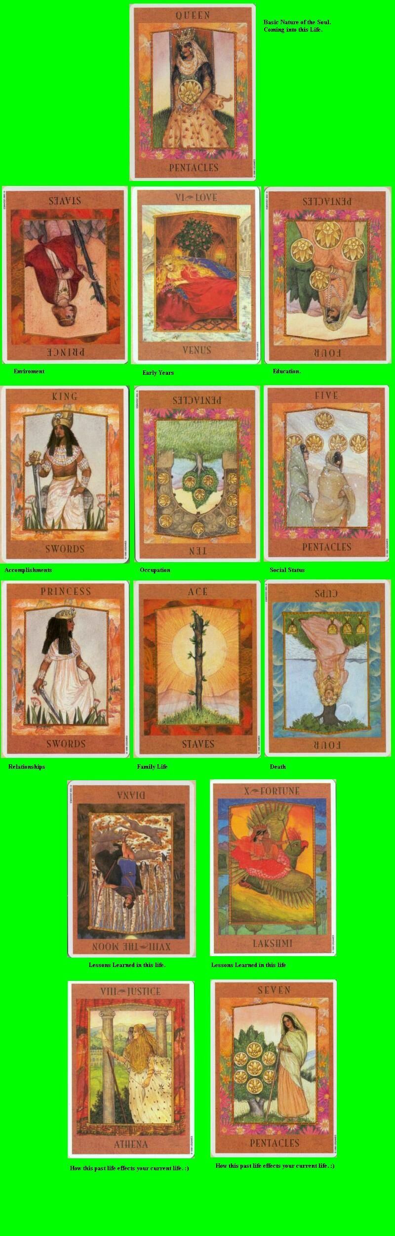 Between this and the social status, I know you have told me before that you were a priestess in a past life, but this spells it out sooo clearly. And now I think I understand the King...this line may read that you were initiated into the life of an earth priestess, this was your calling.It seems that you chose your relationships wisely. Certainly not the heart on your sleeve type of person. I think your partner would have to be a very strong person or you may not have hung around for long. Someone who could challenge you mentally? That is, if you ever left the circle of priestesses, you may very well have been guarding yourself with that sword. Your family I would say were the close circle of people around you who also had the calling to work with the earth. The sun is the main part of the card, so I'll venture to say that what your 'family' represented had much to do with the sun and earth.